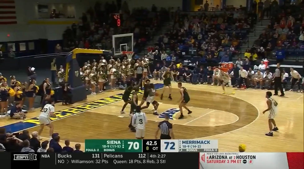 NORTH ANDOVER, MA — MAAC Player of the Year frontrunner Kevair Kennedy scored a career-high 32 points Friday night to lead the Merrimack men’s basketball team to a 79–72 overtime win over Siena.